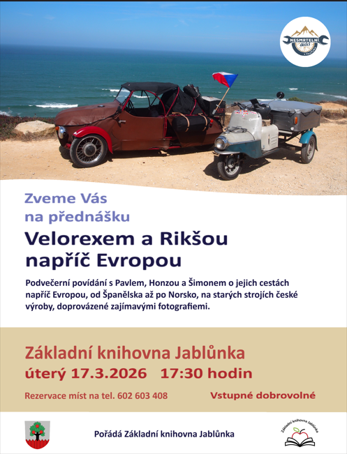 Srdečně vás zveme na cestovatelskou přednášku Velorexem a Rikšou napříč Evropou. V úterý 17. 3. v 17:30 u nás v knihovně. Motorističtí nadšenci Pavel, Honza a Šimon Vás vezmou na dobrodružnou cestu napříč Evropou na legendárních strojích, jako je Velorex a tradiční rikša. Těšit se můžete na příběhy plné dobrodružství, zážitky ze starých strojů na...
